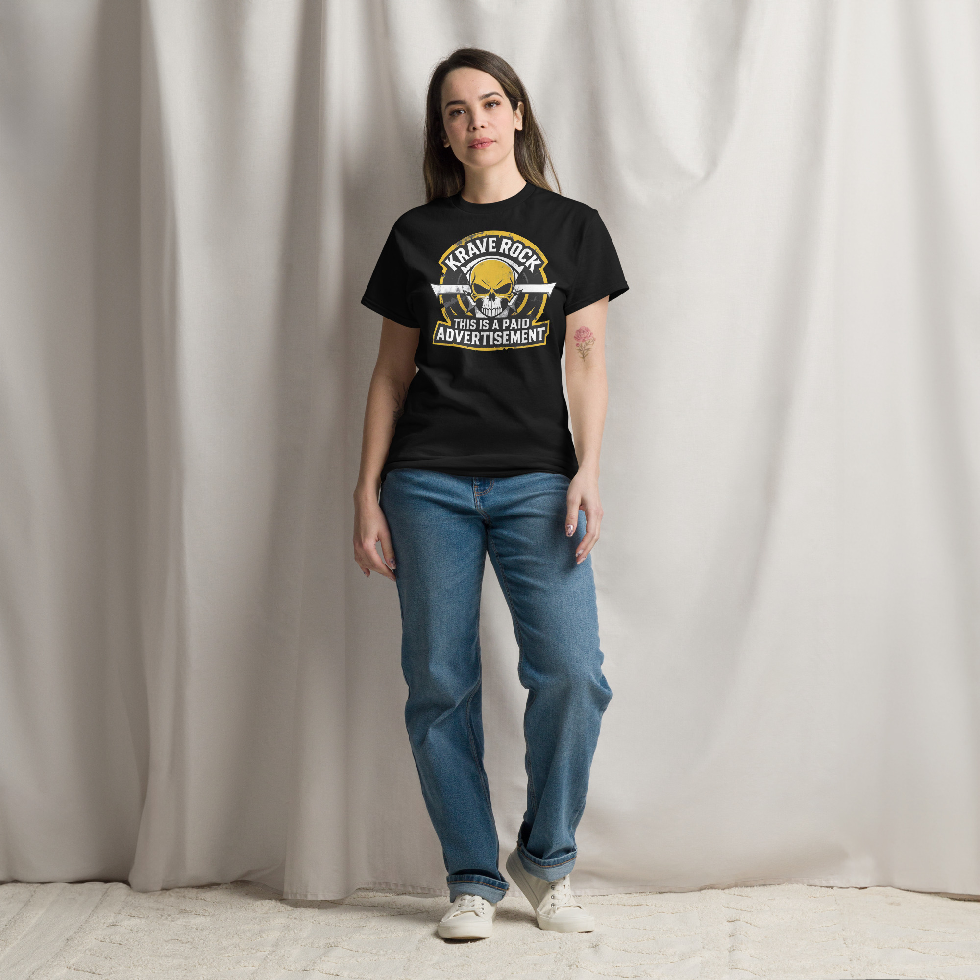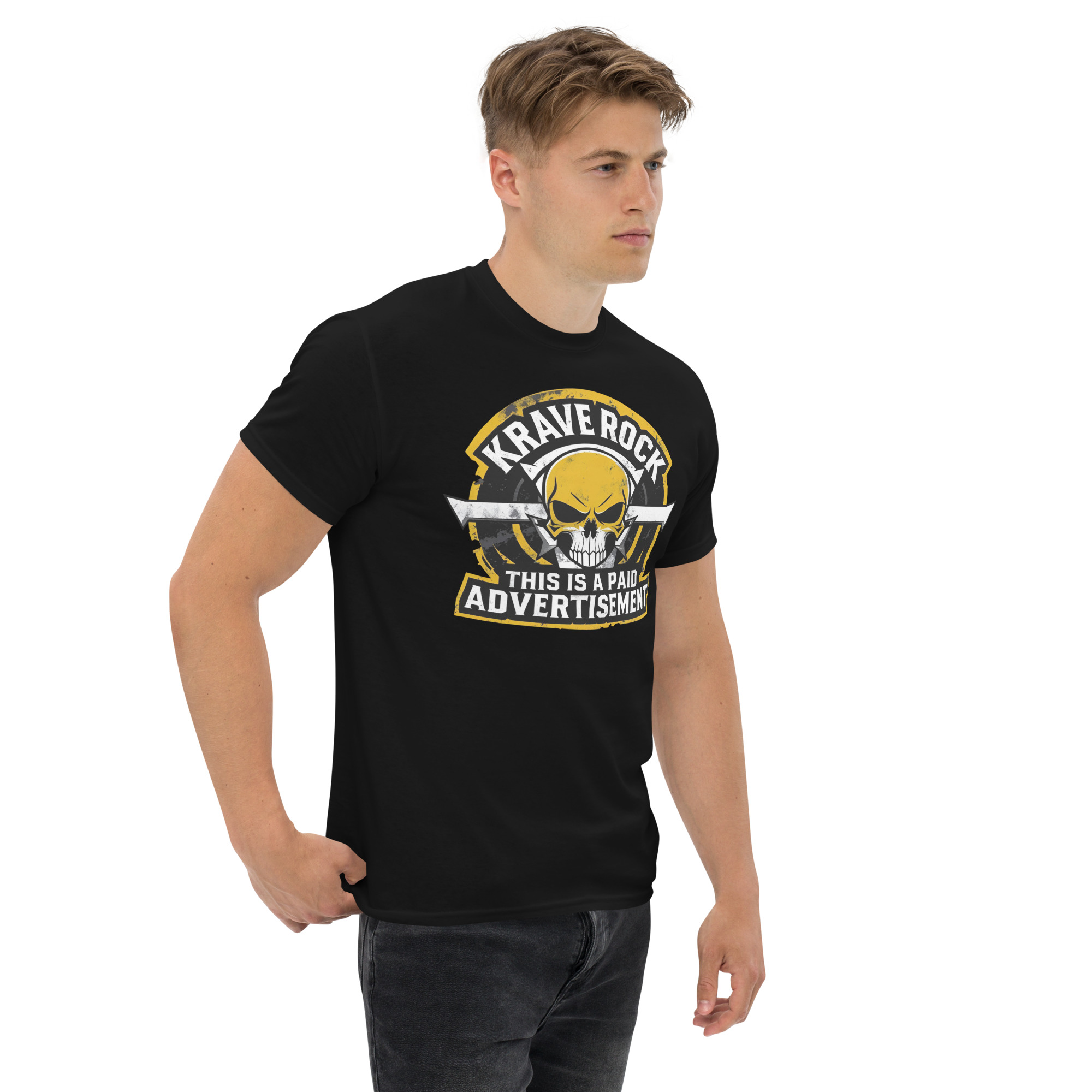 You’re not just wearing a shirt—you’re broadcasting a message. Loud. Proud. Paid. This bold Krave Rock design features a distressed yellow skull locked in behind sharp-edged arrows, backed by a gritty black-and-yellow combat-style badge. The top screams KRAVE ROCK, and the bottom makes it clear: